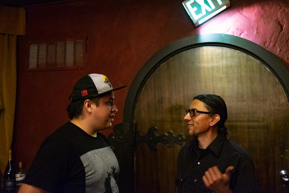 Howie Echo-Hawk and Danny Littlejohn, another Indigenous comic in Seattle, chat between sets. (Photo by Tristan Ahtone/High Country News)