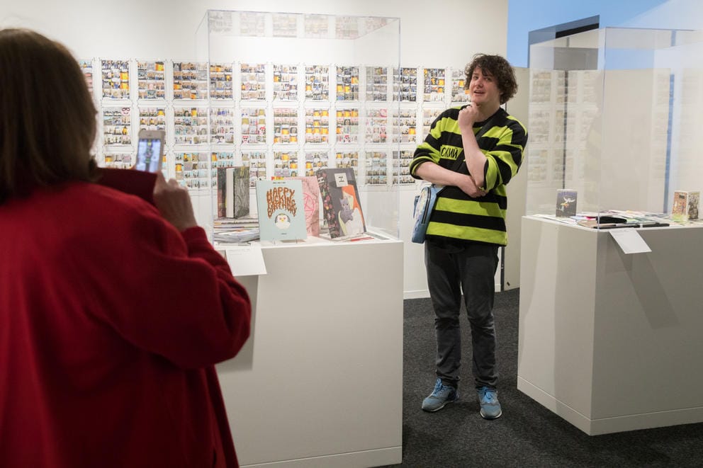 Simon Hanselmann poses for a visitor while putting some final touches on his exhibition Bad Gateway at Bellevue Arts Museum. (Photo by Matt M. McKnight/Crosscut)