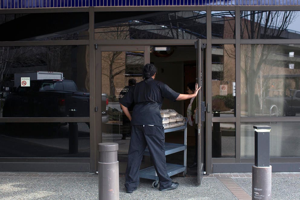 Swedish Medical Center staff wheel a tray of Matador-donated meals donated toward the emergency room, March 17, 2020. Many health workers haven't been able to leave the hospital and are putting in longer than normal hours during the COVID-19 pandemic.