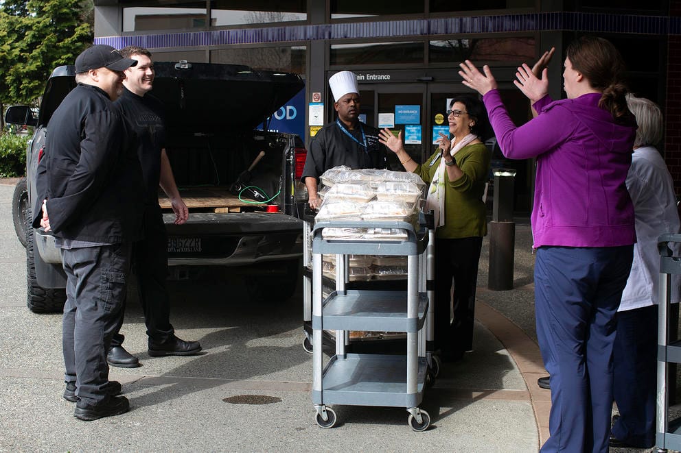 Puspita Majumdar, center, and others from Swedish Medical Center in Ballard applaud, from left, Charles Dobbins and Darren Lee of Matador restaurants for donating 75 prepared meals to the medical staff, March 17, 2020. "Some of them are working all day and night," Dobbins said, referring to the nonstop response of health workers navigating COVID-19. "We're preparing a little chips and salsa and burritos to help them."