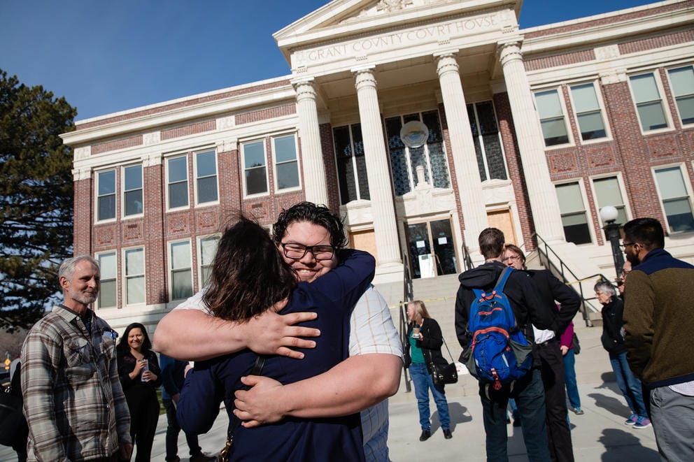 Martín Martínez, de la Spokane Immigrants Rights Coalition, abraza a una de las organizadoras de una reunión en el Juzgado del Condado de Grant en Ephrata, Washington. (Fotografía de Jerome A. Pollos para Crosscut)