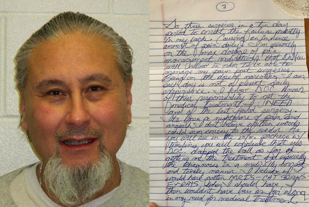 Incarcerated since 2007, Michael Sublett has complained about back pain from a 2016 back surgery in which metal rods placed in his back began to fall apart almost immediately. “It’s been a nightmare of pain and anguish,” he wrote in a 14-page handwritten letter detailing his treatment. (Washington Department of Corrections; Michael Sublett)