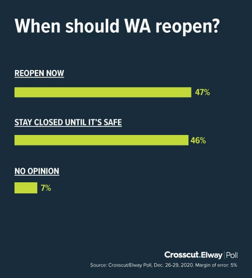 Most Washingtonians polled in December said they were staying home alone or just with members of their household to celebrate the holidays, as Gov. Jay Inslee had asked, after state data indicated people were spreading the virus through small gatherings. But 10% said they were celebrating with friends and 5% planned to go out to a restaurant or to a holiday party.