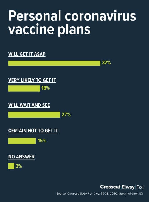A new Crosscut/Elway Poll of Washington voters conducted between Christmas and New Year’s Eve found 55% intended to get vaccinated, including 37% who were certain to get vaccinated as soon as they could. Eighteen percent said they were very likely to get the vaccine, but 27% said they planned to wait and see and 15% were certain they would not get vaccinated.