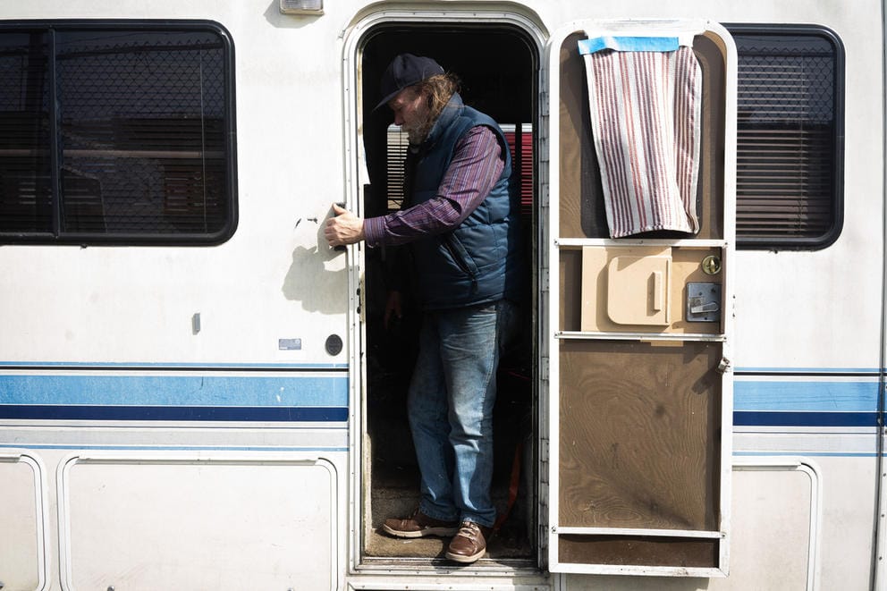 Neal Lampi exits his RV along Third Avenue in Seattle's SoDo area on March 31, 2021. "I work Monday to Friday as a vendor for Real Change," says Lampi, who looks for some sense of normalcy in abnormal times with his schedule. "I've been waiting for nearly a year for my unemployment and stimulus checks due to the pandemic. I call my elected officials almost daily and leave the messages but I never hear back." (Matt M. McKnight/Crosscut)