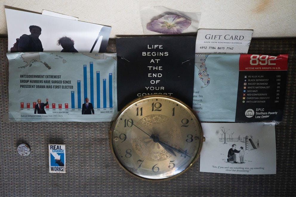Decorations and keepsakes, including a comically tuned broken clock, adorn the walls of Neil Lampi's RV along Third Avenue in Seattle's SoDo area on March 31, 2021. (Matt M. McKnight/Crosscut)