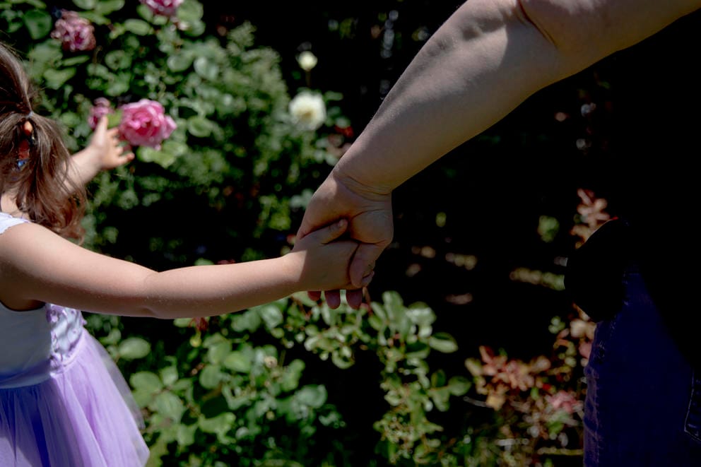 K.T. and her 6-year-old daughter in their backyard rose garden on June 1, 2021. (Dorothy Edwards/Crosscut)