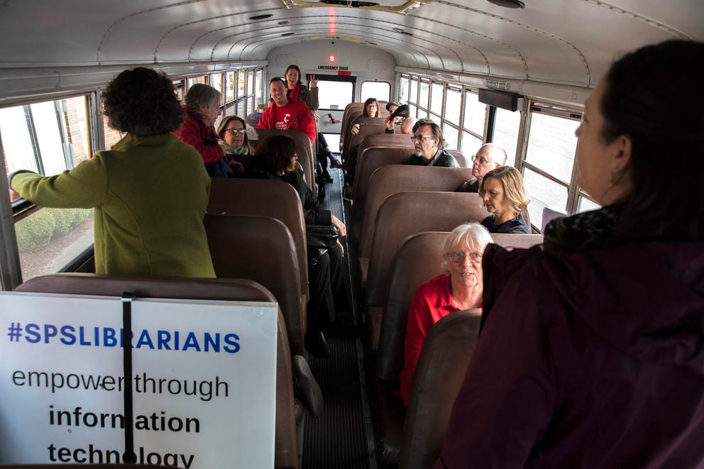 Seattle Public Schools librarians aboard a bus en route to Olympia for a day of protest and lobbying legislators, April 2, 2019.