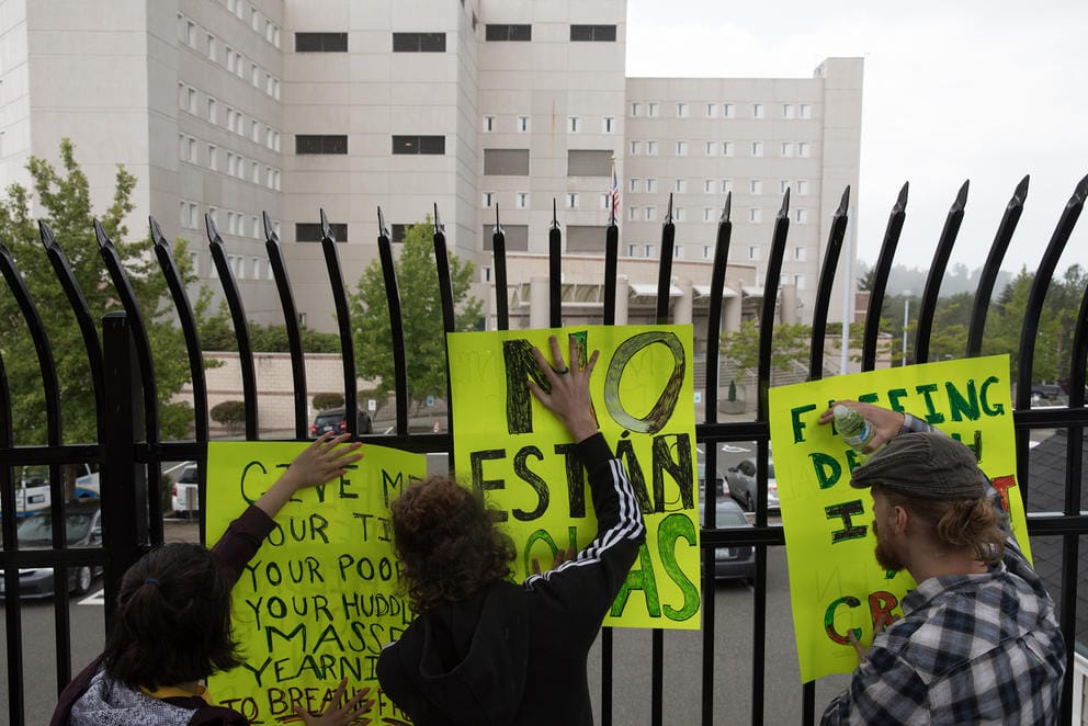 Protesters gather outside the SeaTac federal prison on June 9, 2018. (Matt M. McKnight/Crosscut)